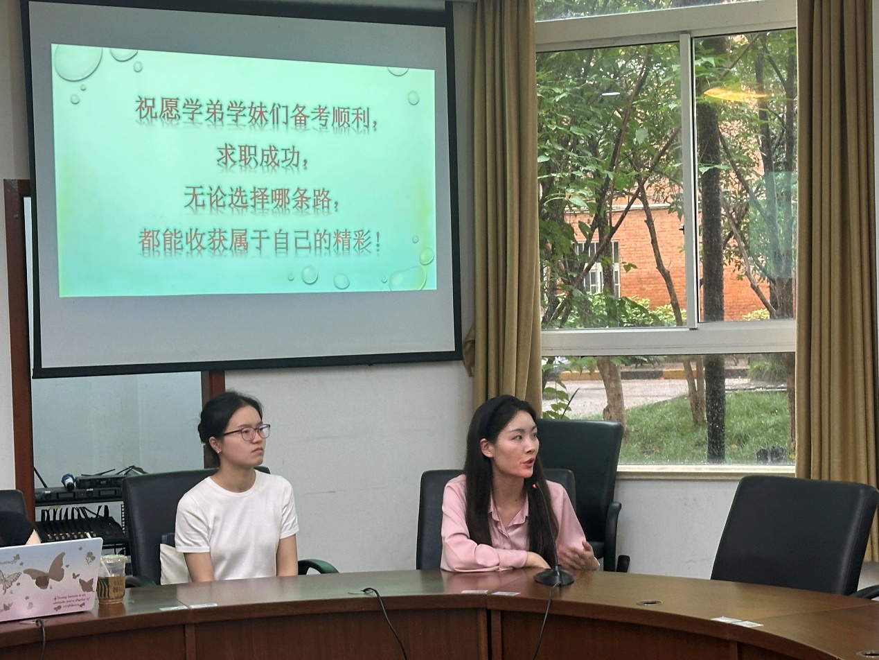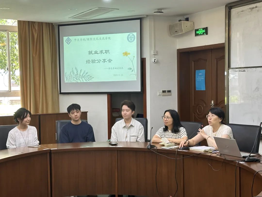 为帮助学生全面了解就业形势、科学规划职业路径、明确目标方向,中文学院/国际文化交流学院于6月13日在虹口校区二号楼第一阶梯教室举办求职就业分享会。会议邀请了蔡纪光、李潘、张常奥、于倩、刘瑶佳五位2025届毕业生依次分享求职经验与感悟。辅导员祁慧琳老师、汪慧慧老师出席了本次分享会,全院本硕博逾百名学生线上线下踊跃参与。