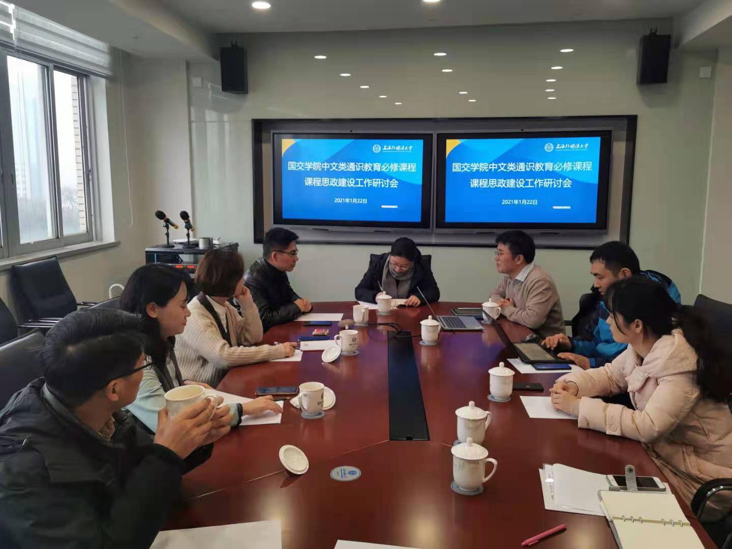 2021年1月22日下午,上海外国语大学国际文化交流学院中文类通识教育必修课思政建设工作研讨会于虹口校区一号楼1010室举行。教务处副处长王会花、国交学院党委书记陈全生、副院长朱建军、中国语言文化教研部主任唐依力和中文类通识教育必修课程任课老师出席了此次会议。与会老师再次学习了教育部《高等学校课程思政建设指导纲要》的指导意见,围绕中文类通识教育必修课“课程思政”建设的现状和方向展开了积极的讨论,不同课程之间也进行了深入的交流。