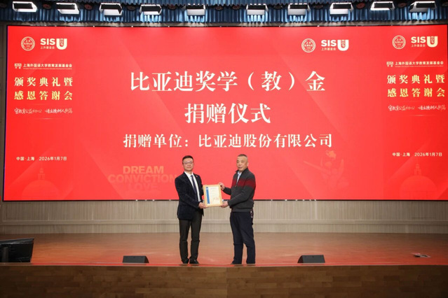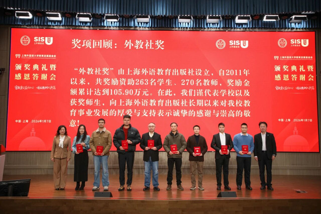 2026年1月7日下午,上海外国语大学教育发展基金会2025年度颁奖典礼暨感恩答谢会在松江校区举行。上海外国语大学校长孟钟捷、副校长衣永刚、捐赠方代表、获奖师生及校内外嘉宾近400人参会。