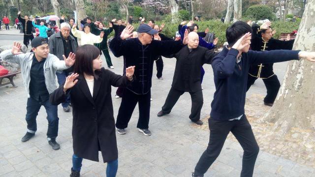 学生们经过前期精心的准备,在会话老师的带领下如期来到鲁迅公园。学生以小组为单位分别活动,各组主动与公园内活动的大爷大妈交流,并积极加入某一项活动。他们有的加入了太极拳组,有的加入了羽毛球组,有的加入了交谊舞组,有的跟随大爷们在水泥地上挥毫练习书法。最后,每组都会选定一个人,以采访的形式与公园内的人群进行了深入交流,充分了解此活动,配以录音、照片,将所见所闻整理成报告,准备在下节课上在班级内做汇报交流。