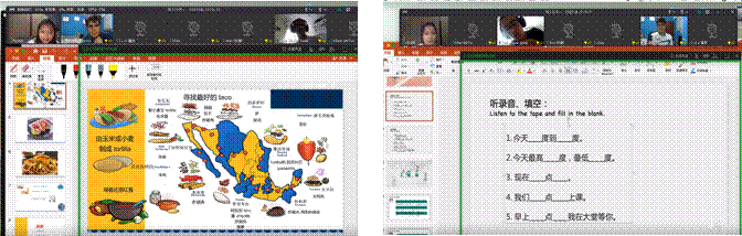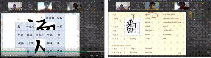 特色汉语课程采用直播授课的形式,教师与学生实时互动;同时考虑到时差问题,课程分别在下午和晚上设课,确保来自世界各地的学生都能参与学习。汉语课程强调“乐学”的宗旨,课堂采用形式多样的教学活动,让学生不仅能提升汉语水平,还能加深对中国文化的理解。