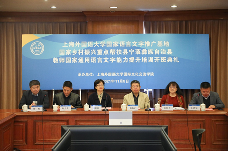 11月8日,上海外国语大学国家语言文字推广基地国家乡村振兴重点帮扶县宁蒗彝族自治县教师国家通用语言文字能力提升培训班开班典礼在虹口校区英伦厅隆重举行。上海外国语大学校长办公室(乡村振兴工作领导小组办公室)主任蒋昕宇,国际文化交流学院院长张艳莉、党委书记陈全生、副院长朱建军,培训项目负责人、专家组代表、团队代表参加典礼,上海外国语大学国家语言文字推广基地执行副主任周晓林和宁蒗彝族自治县第二中学100名教师学员以网络连线形式参加典礼。开班典礼由朱建军副院长主持。