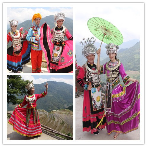 在古东瀑布,奖学金生们沿着瀑布逆流而上,下山时又体验了少数民族常用的交通工具——溜索。在龙脊梯田,奖学金生们领略了700年来壮族先民们的勤劳与智慧。沉浸在梯田的美景中,奖学金生们也穿上了少数民族的服饰,美美地当了一回壮家阿哥阿妹。