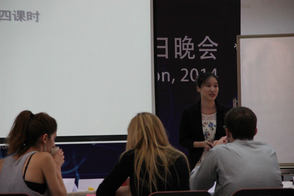 比赛共分为三个环节,第一部分为教学技能展示,评委们根据选手的教态、课堂控制能力、教学展示完整程度等多方面因素给予评分。参赛选手们以14名初级留学生为教学对象,以《跟我学汉语》第一册课文为教学内容,向各评委展示10分钟的教学环节。虽然从拿到课文到教学展示只有三天时间,选手们依然做了充分的准备。人体时钟、骰子、儿歌、毛笔……各种道具应有尽有,为老师和学生们带来了10场极具个人风格的教学展示。