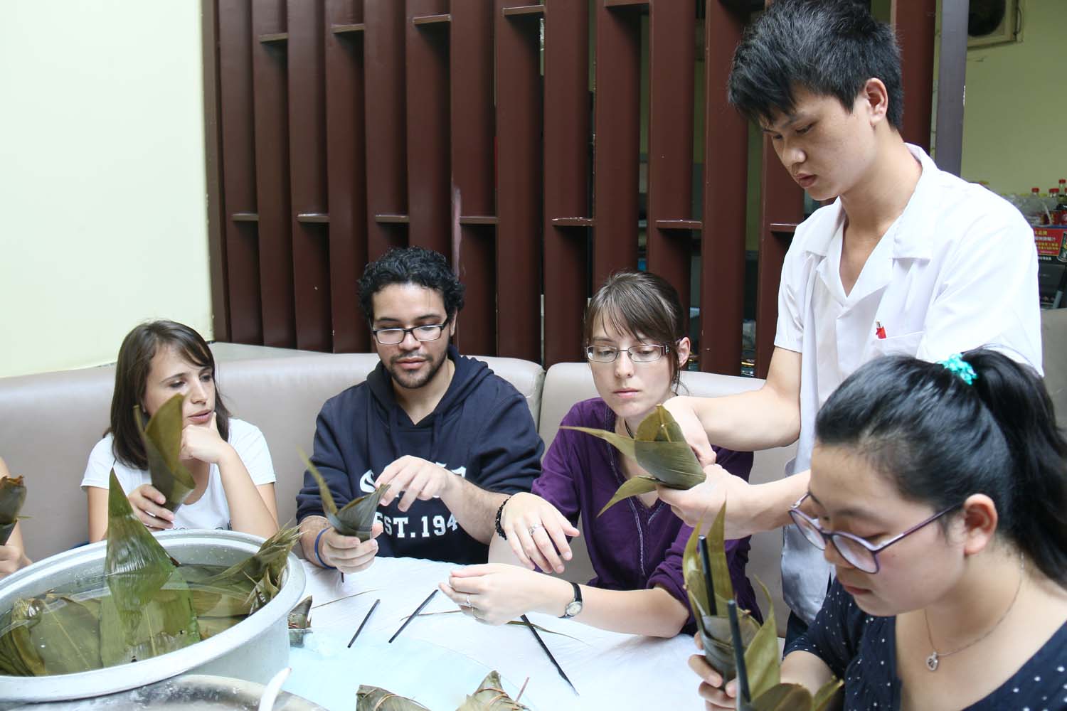 为了让孔子学院奖学金生更好地了解中国传统节日——端午节,2014年6月5日下午上外国交学院组织孔子学院奖学金生一起来到饭店包粽子体验端午节。