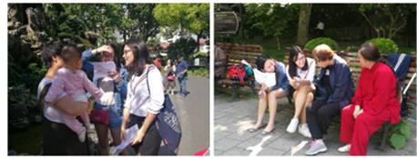 一进公园,一位抱着孩子的年轻妈妈就接受了印尼学生张翠慧和苏晶晶的采访,顺利的开始燃起了她们的兴致。不一会儿,她们又跟刚练完太极的两位阿姨攀谈了起来。