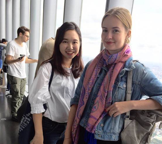 到达上海中心大厦后师生首先观看“上海中心”宣传片,随后搭乘18米/秒的超高速电梯,直达位于118楼的“上海之巅”观光厅,电梯平稳舒适,大家还没来得及反应就已抵达546m的高空。在那里,老师和同学们一起鸟瞰上海城市风貌,360度欣赏浦江两岸的风景,老师们向学生仔细介绍众多的知名建筑,讲解“会当凌绝顶,一览众山小”的豪情,留学生班长们还纷纷用空中邮局为远方的家人送去问候和祝福。