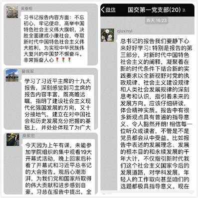 10月18日上午,中国共产党第十九次全国代表大会在人民大会堂开幕,习近平总书记代表第十八届中央委员会向大会作报告。上午9:00,国交学院党政领导和党员群众代表共同收看十九大开幕会直播。18日下午国交学院教工第一支部召开“我学十九大”专题组织生活会,广大党员畅谈体会,抒发情感,迅速掀起学习十九大报告热潮。