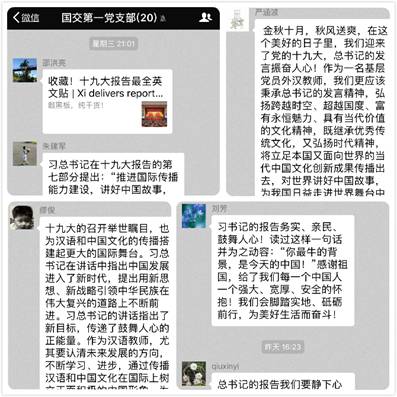 党员教师范立珂说,今天对于我,注定是个一生中难忘的日子,党的十九大胜利开幕,我的生日,一天后,因为教育部教师队伍建设示范项目,作为科研骨干,我将远赴美国访学一年,这样的日子里,我的幸福感真的是爆棚!从我内心,我感恩这么多年来党对我的培养,感恩我们国交学院对我的培养,感恩上外、国交学院这么好的平台,感恩这个美好的时代!总书记的讲话中说到,中央要加大高校科研工作经费,要提高高校科研人员的工资待遇,我们相信,乘着十九大的东风,我们的教学科研工作会再上一个新的台阶,会迎来更加美好灿烂的春天!我个人,会非常珍惜这次在外研修的机会,认认真真、踏踏实实,保质保量地完成我的科研任务!以不辜负学院对我的培养,不辜负学院领导对我的期待,不辜负我的科研理想!不忘初心,方得始终!