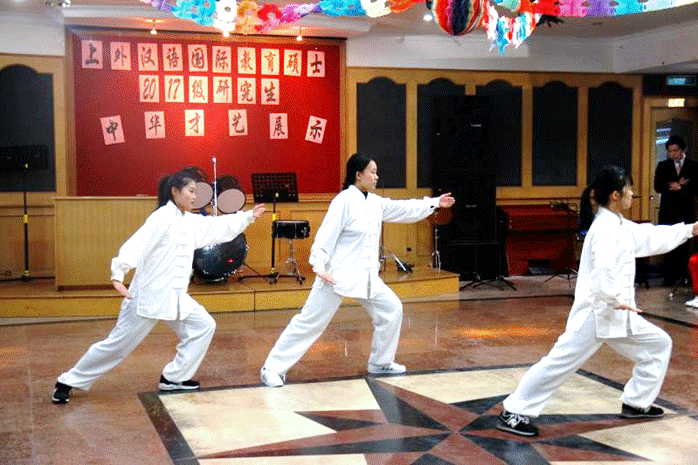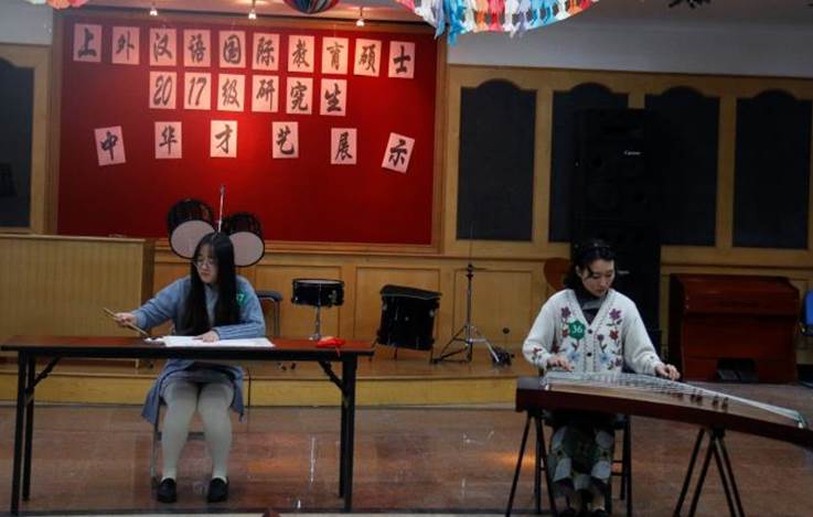 外国学生、中国学生分别表演的太极拳、太极扇以气势恢宏的动作拉开了活动的序幕:两人组的太极剑和三人组的木兰扇刚柔并济;《穿越时空的思念》将宛转悠扬的陶笛和竹笛、气贯山洪的书法以及惟妙惟肖的国画熔于一炉;中国学生用葫芦丝演奏和歌唱的《三寸天堂》婉转动听。接着,由中阮、葫芦丝演奏的《亲爱的朋友》、由琵琶、萧、书法组成的《星月神话》、由葫芦丝和国画组成的《菊花台》、二胡独奏《喜洋洋》以及由古筝、琵琶、笛子等表演的乐曲《秦桑曲》《凉凉》轮番上阵,获得了现场评委和同学们的一致喝彩。