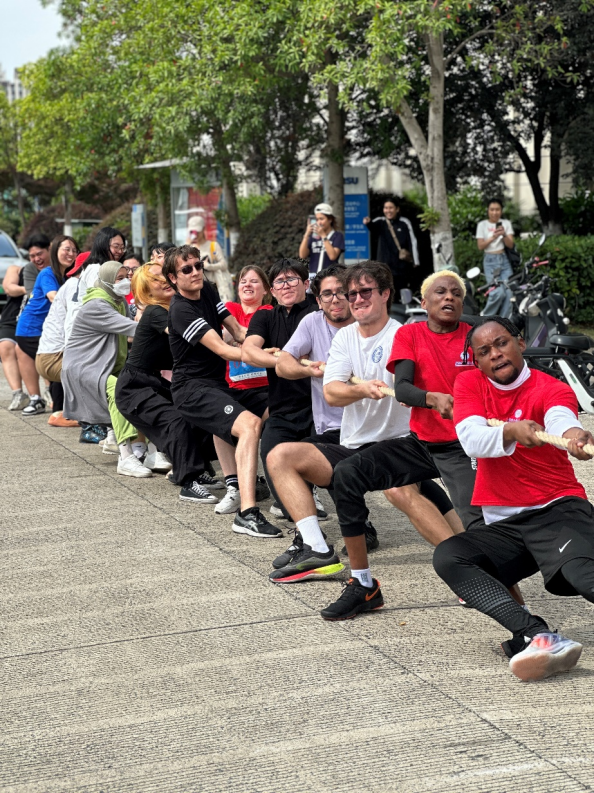 在学生组拔河比赛中,留学生代表队先后击败国际教育学院、新闻传播学院代表队,进入决赛,最终获得第四名。