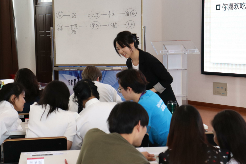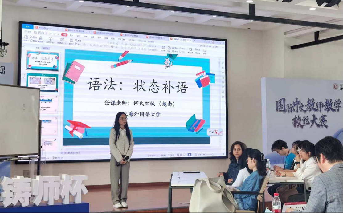 决赛当天,我院的6名选手自信从容、沉稳谦虚,获得了评委老师的高度评价。她们在赛场上展示自己的教学风采,与留学生同学进行课堂互动,与资深专家进行深入交流,提升自己的专业技能。此外,我院多名中外研究生还组成了“上外啦啦队”,专程来到现场为选手们加油打气,同时观摩精彩课堂,积累教学经验。