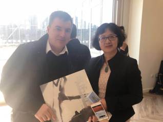 (国际文化交流学院院长张艳莉与诺贝尔物理学奖获得者、石墨烯发现者诺沃肖洛夫教授合影留念)