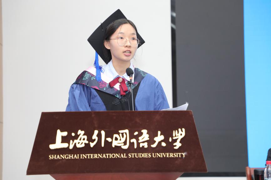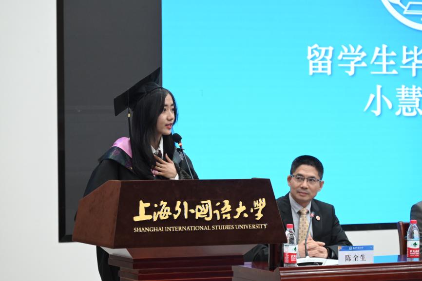 老挝学生PHONESUDA SIPHAKDY(小慧)同学、中国研究生蔡沛文同学作为毕业生代表先后发言,分享了在上外求学期间的点滴,同时感谢了学院所有老师的辛苦付出以及上外这个大家庭为他们创造的优越条件。