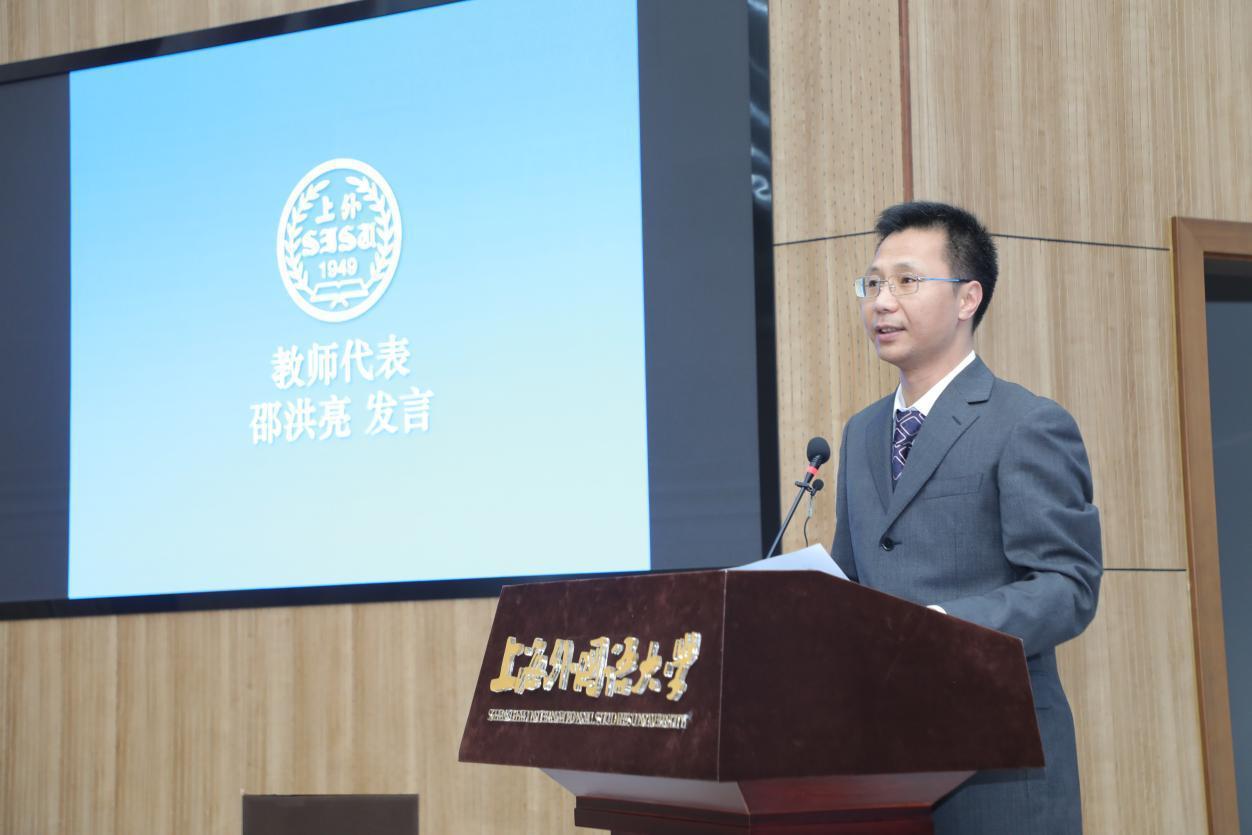邵洪亮老师代表全体教师发言。邵老师希望各位毕业生在今后的人生道路上,要做善良、谦和、为他人着想的高尚的人,要做独立思考、不人云亦云的人、要做有担当、有大格局的人,努力让自己的人生有意义,多学习,多旅行,用心体会人生的精彩。最后邵老师代表学院全体教师祝愿所有毕业生前程似锦,归来仍是少年。