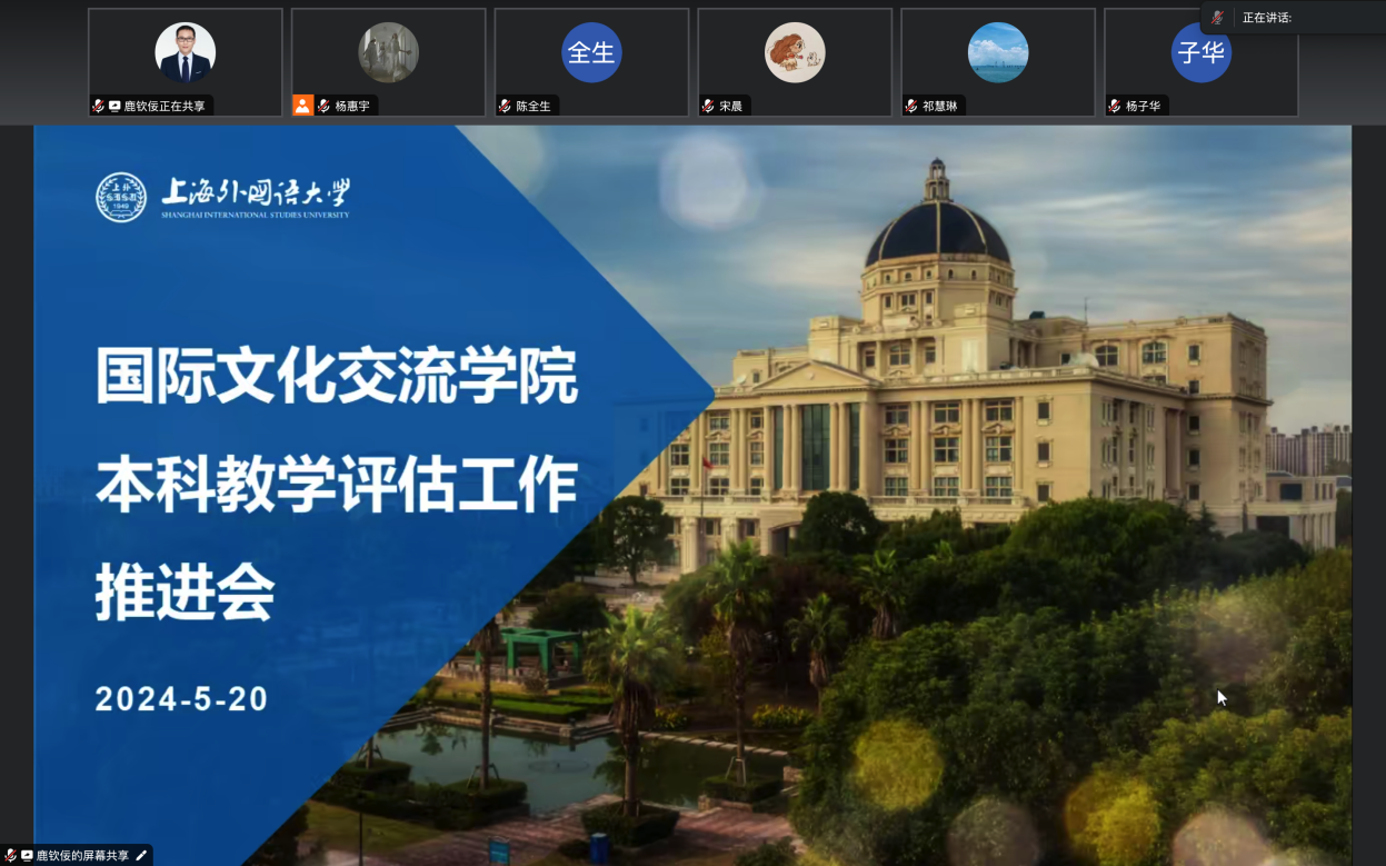 2024年5月20日,国际文化交流学院本科教学评估工作推进会在线上顺利召开,学院全体教职员工参加。推进会上,院长张艳莉、副院长鹿钦佞、留学生中文教研部主任邵洪亮分别就本科教学评估工作进行了多层面、多角度的详细介绍与周密部署。