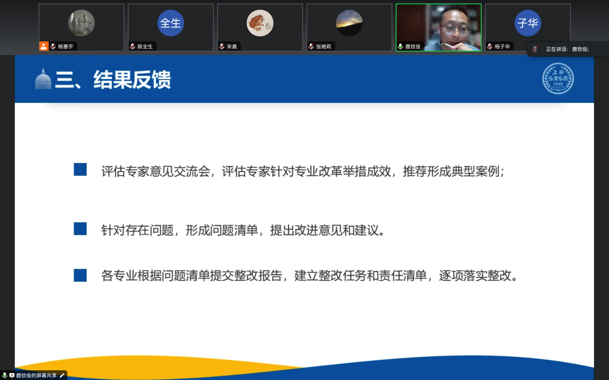 鹿钦佞副院长重点就整体工作方案及学院内部工作计划进行了安排与梳理,从学院参与评估的具体专业及课程、评估方式、评估时间、评估流程及相应节点、结果反馈,以及当前需要完成的其他准备工作等方面,对审核评估的具体方案及执行计划等信息进行传达与解读。