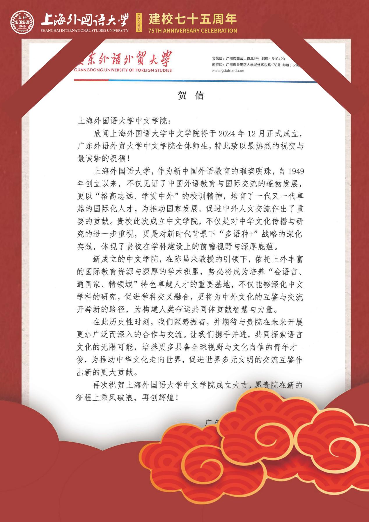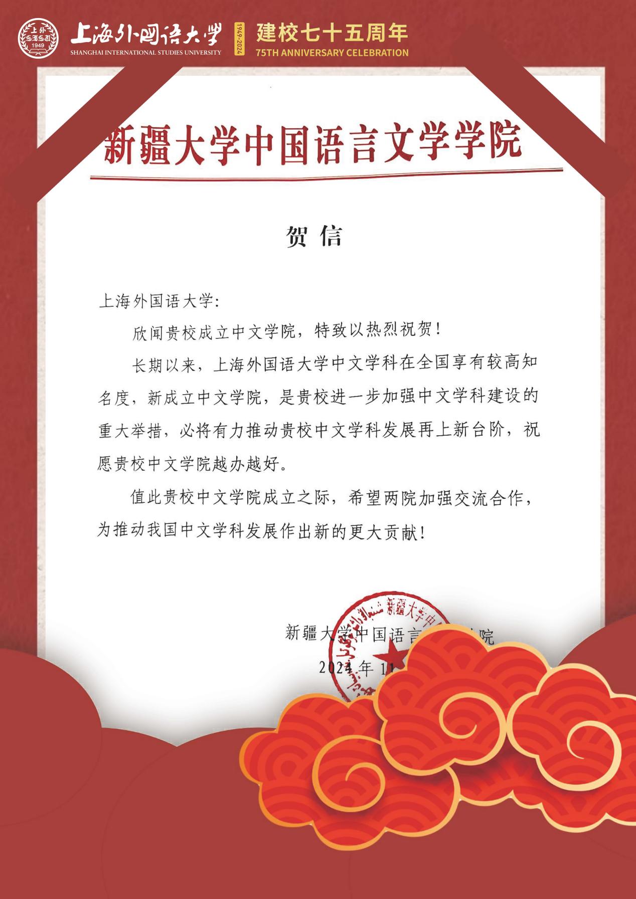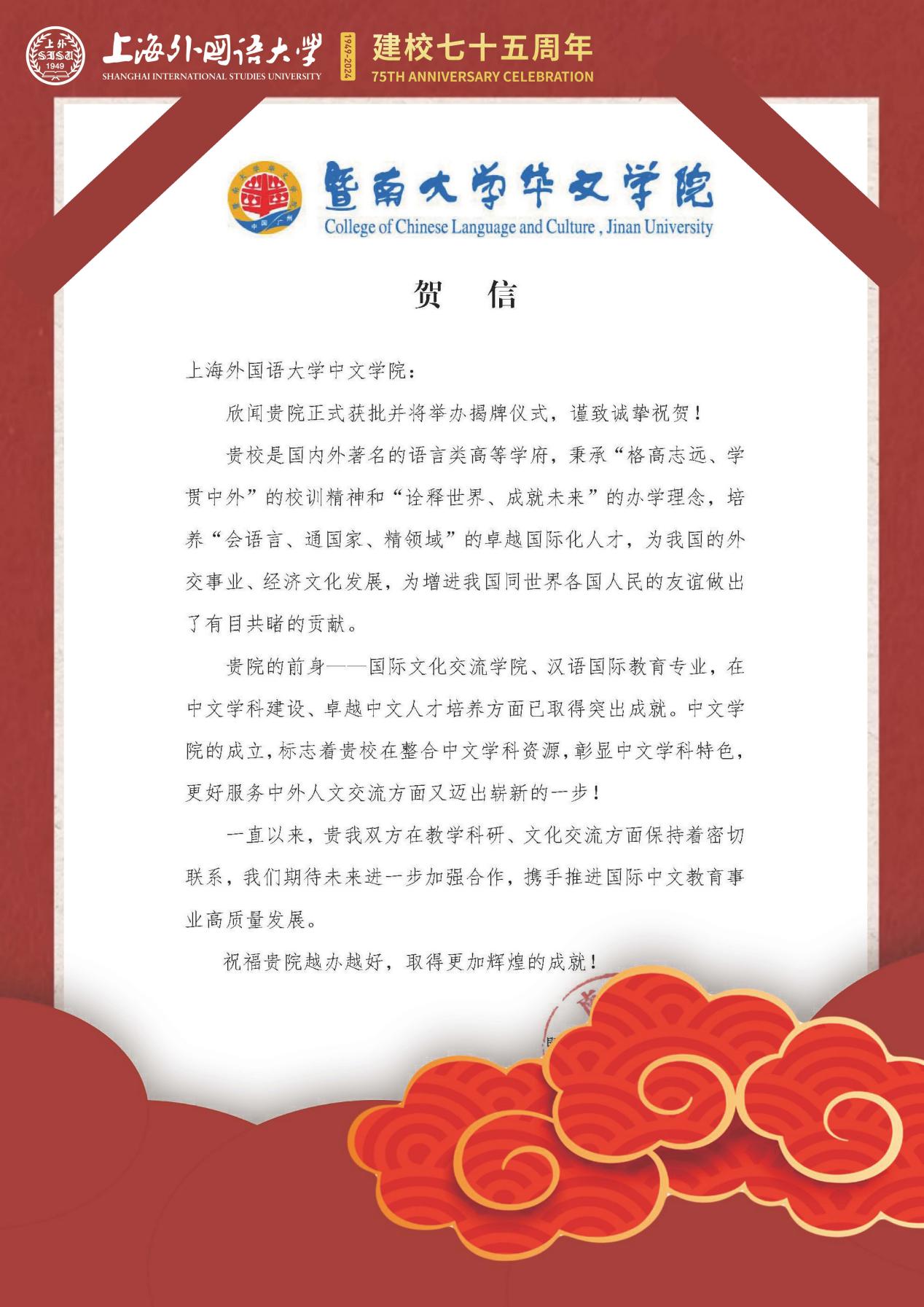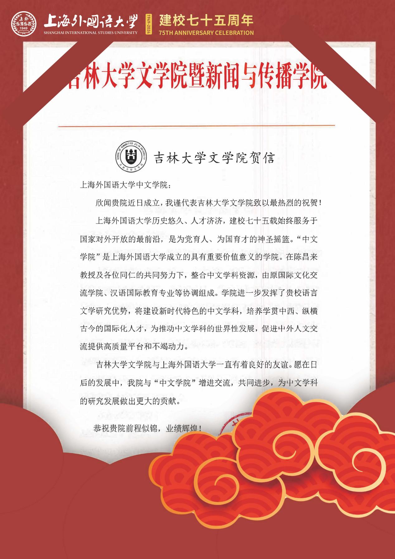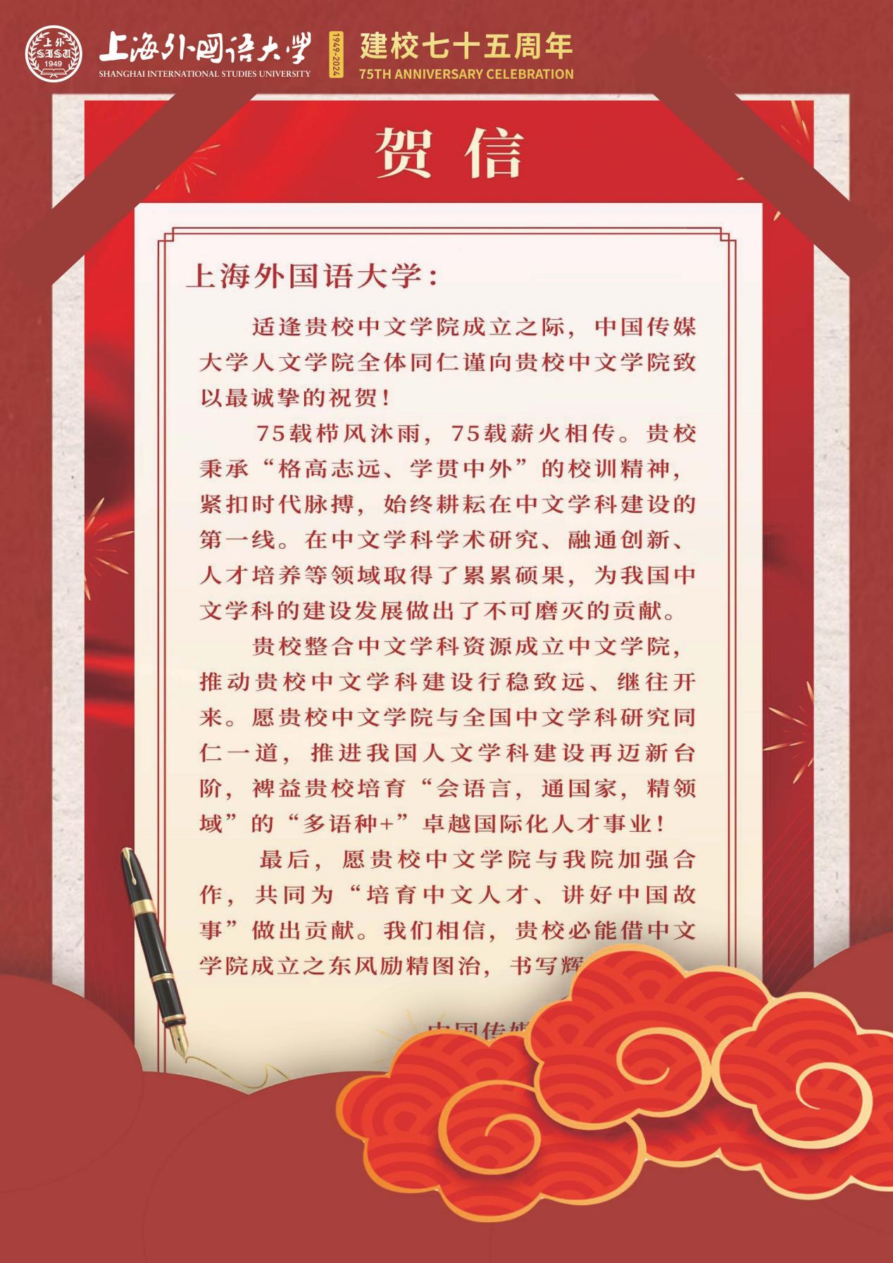 学院共收到32封来自全国各地兄弟院校的贺信