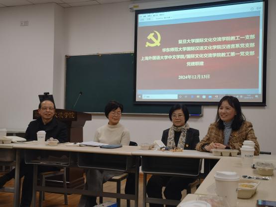 12月13日,我校中文学院/国际文化交流学院教工第一党支部与复旦大学国际文化交流学院教工第一党支部、华东师范大学国际汉语文化学院汉语言系党支部,开展三校党建联建主题党日活动,三十余名党员教师在复旦光华楼东主楼801室进行了热烈的交流与研讨,室外寒风料峭,室内春风拂面。活动由徐晓羽(复旦)、祁峰(华师大)、黄健秦(上外)三位支部书记主持。