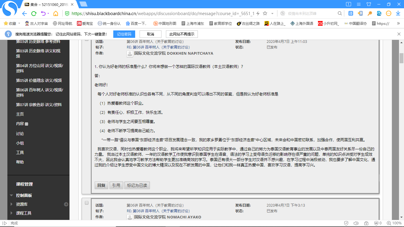 3 留言板互动。在留言板设置开放性的题目,自主作答,但每次学生的回答率都超过90%。有一次教师忘了创建论坛话题,日本同学帮忙创建了,还有同学觉得留言板不够尽兴,还直接发来图文并茂的word文档。教师可在回帖中因人、因时施教。