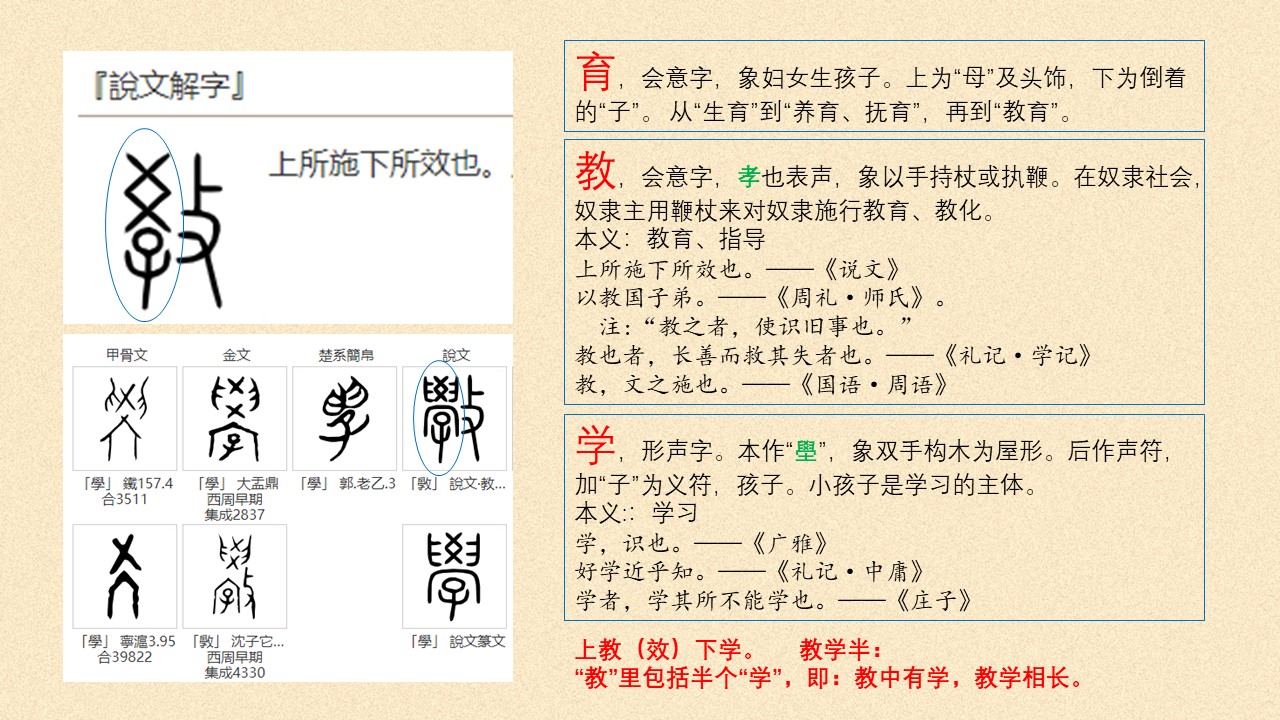 讲“教育学”,三字的本义皆与“子”有关,既是孩子的“子”,生孩子、教孩子、孩子在校学习;也是孔子的“子”,自然引出传统的德育观念,结合十九大报告以来的教育成就,让学生建立教育的荣誉感与使命感。