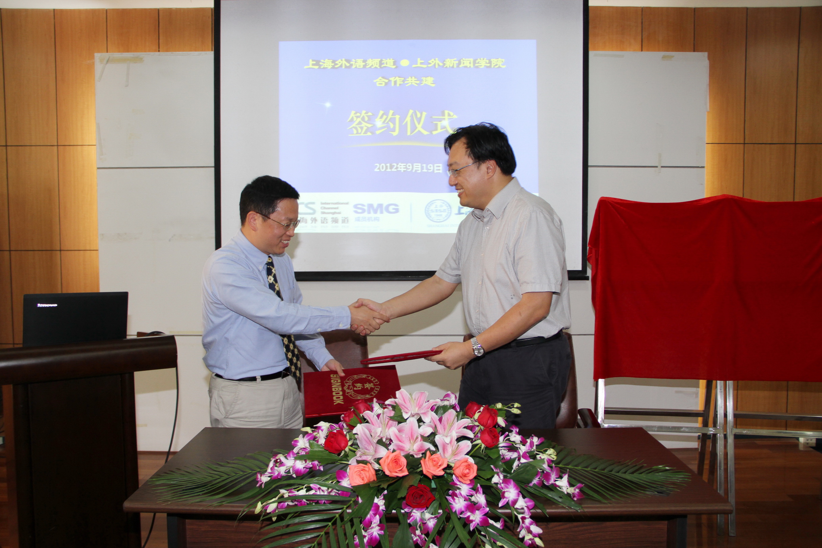 2012年9月19日下午,在上外图文T220报告厅举行了上海外语频道与上外新闻学院合作共建签约揭牌仪式。上海外语频道(ICS)总监孙伟一行、校科研处、宣传部和信息技术中心等领导参加了签约揭牌仪式。仪式由新闻学院总支书记刘蓉蓉主持。
