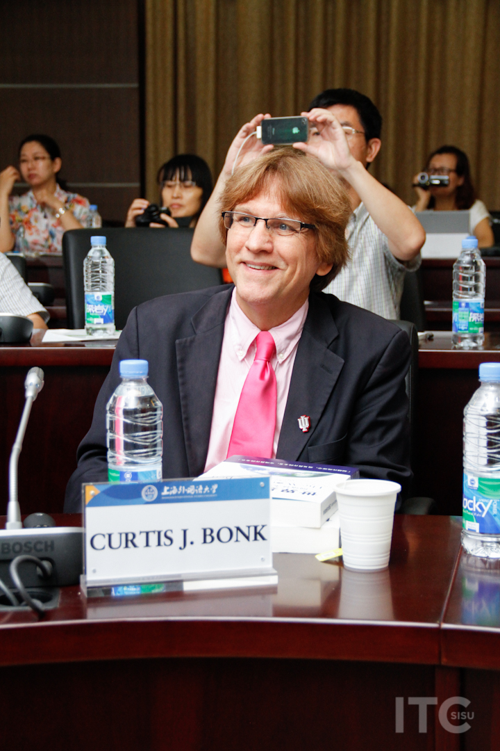 2015年6月16日,“在线学习、慕课与开放教育”国际研讨会在上海外国语大学虹口校区会议中心第二报告厅隆重召开。会议由研究生部和新闻传播学院联合主办。上海外国语大学副校长冯庆华教授,美国印第安纳大学CurtBonk博士,“LumenLearning”机构创始人之一DavidWiley博士,弗罗里达州立大学VanessaDennen博士,美国韦恩州立大学张珂博士,香港大学负责慕课开发与设计工作的程景利博士,上海外语音像出版社社长陈坚林教授,上海外国语大学国际教育学院郑新民教授、对外合作交流处处长张红玲教授、新闻传播学院院长郭可教授、研究生部主任汪小玲教授、新闻传播学院院长助理金慧副教授等出席了本次研讨会。来自华东师范大学、华南师范大学、北京理工大学、东华大学等高校的教育技术学专家及我校的教师代表、研究生代表等100余人参加了此次研讨会。会议开幕式及后续各研讨环节分别由汪小玲教授、郭可教授、张红玲教授、陈坚林教授和郑新民教授主持。