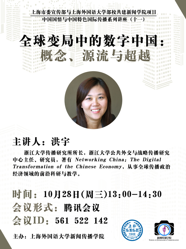 主讲人:洪宇,浙江大学传播研究所所长浙江大学公共外交与战略传播研究中心主任、研究员,著有《Networking China: The Digital Transformation of the Chinese Economy》,从事全球传播政治经济领域的前沿科研与教学。
