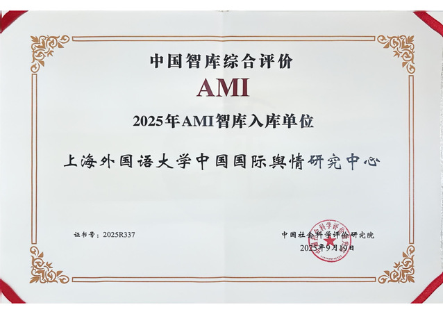 此次入选“中国智库综合评价2025年AMI智库”,是对上海外国语大学中国国际舆情研究中心多年来深耕外宣型智库建设的肯定。中心将以此次荣誉为契机,持续发挥多语种跨学科优势,聚焦涉华国际舆情分析、国际传播多语叙事研究、国别国际传播案例库建设等核心领域,深化产学研一体化合作。未来,中心将继续锚定学校“建设智库高地、打造上外智库集群”的目标,以更精准的研究成果服务党和政府科学决策,助力提升中国国际传播效能。