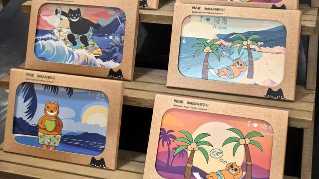 “阿百猫”文创品牌以独具海南特色的IP形象吸引游客的目光。这一形象创意源自海南方言“百爹”(意为阿伯),通过拟人化的猫咪造型,生动展现海南人乐观幽默的生活哲学。品牌开发的系列文创产品,包括帆布包、明信片、椰雕工艺品等,还巧妙地将方言文化与海岛风情融入生活日用。
