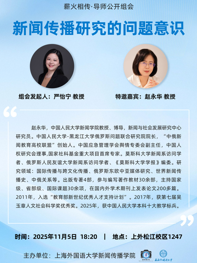 严怡宁教授发起,特邀中国人民大学赵永华教授主讲,与国际新闻传播领域的领军学者面对面,深入对话“问题意识”的学术方法论,带来一场高含金量的科研思维启发!