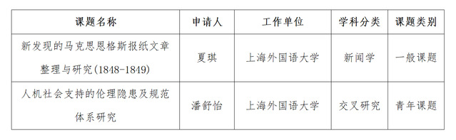 近期,2025年度上海市哲学社会科学规划课题立项名单公布,我院夏琪博士主持的《新发现的马克思恩格斯报纸文章整理与研究(1848-1849)》、潘舒怡博士主持的《人机社会支持的伦理隐患及规范体系研究》获批立项。