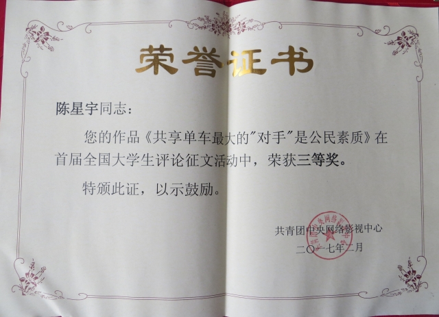 陈星宇 (上海外国语大学) 《共享单车最大的“对手”是公民素质》