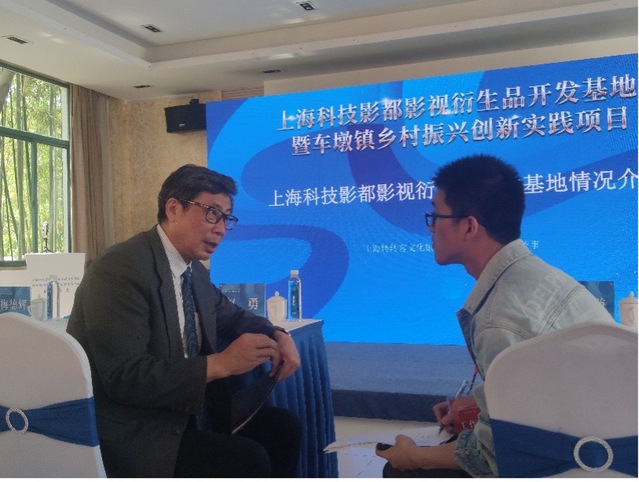 除了启动仪式的执行工作,志愿者队伍还对参会嘉宾进行了采访。来自19级新闻学的王兆隆同学采访了复旦大学国家文化创新研究中心主任孟建教授。谈到这次基地策划的策划背景,孟建教授表示“衍生品开发基地这个项目,有文化强国、乡村振兴以及视听中国这三项政策支持,在影视版权保护的基础上实现开发,就有可能使我们影视产业、网络视听产业形成更完整的产业链,覆盖社会生活的各个领域,从而达到文化产业的利益最大化”。