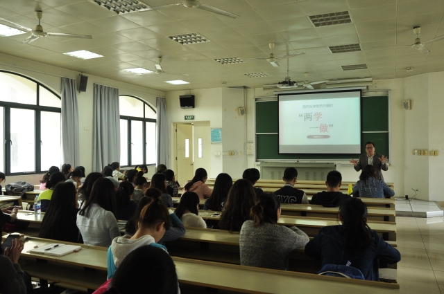 结合“两学一做”的精神和要求,郭可院长对学院学生党员和入党积极分子提出要求,畅谈学院发展方向。在日常生活中既要高度重视政治和理论学习,也要熟练掌握专业知识和技能,在成才过程中找准自身的兴趣点,积极参与校内外活动,要向杨斯童同学学习。学院本学期推出学生社会服务体系,党员和积极分子要能够积极响应带好头。感谢各班同学维护常用教室的清洁卫生,创造良好的教学环境。重点介绍学院正在进行的综合改革、国际化示范学院建设等各项工作,学院坚持立德树人,秉持以促进学生成长成才为核心的育人理念,促进学院和学科发展,希望同学多多参与和献言献策,要求学院学生党员和入党积极分子在日常学习、生活和工作中起到表率作用。