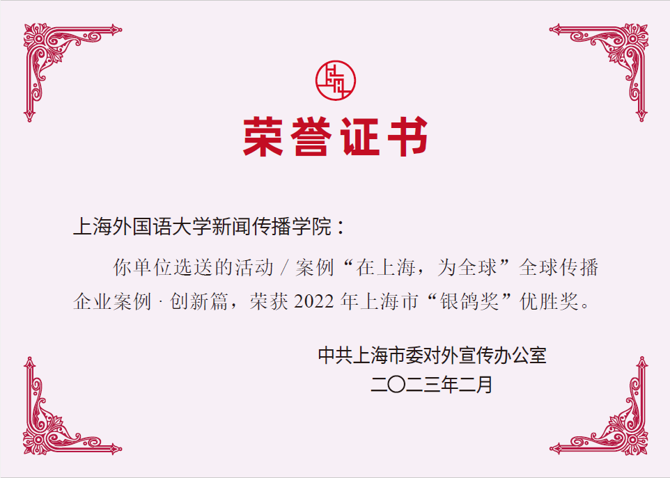 近日,2022年上海市国际传播领域最高奖项“银鸽奖”评选结果揭晓。上海外国语大学新闻传播学院参与报送的“在上海,为全球”系列全球企业传播案例中5个项目脱颖而出,荣获该奖。