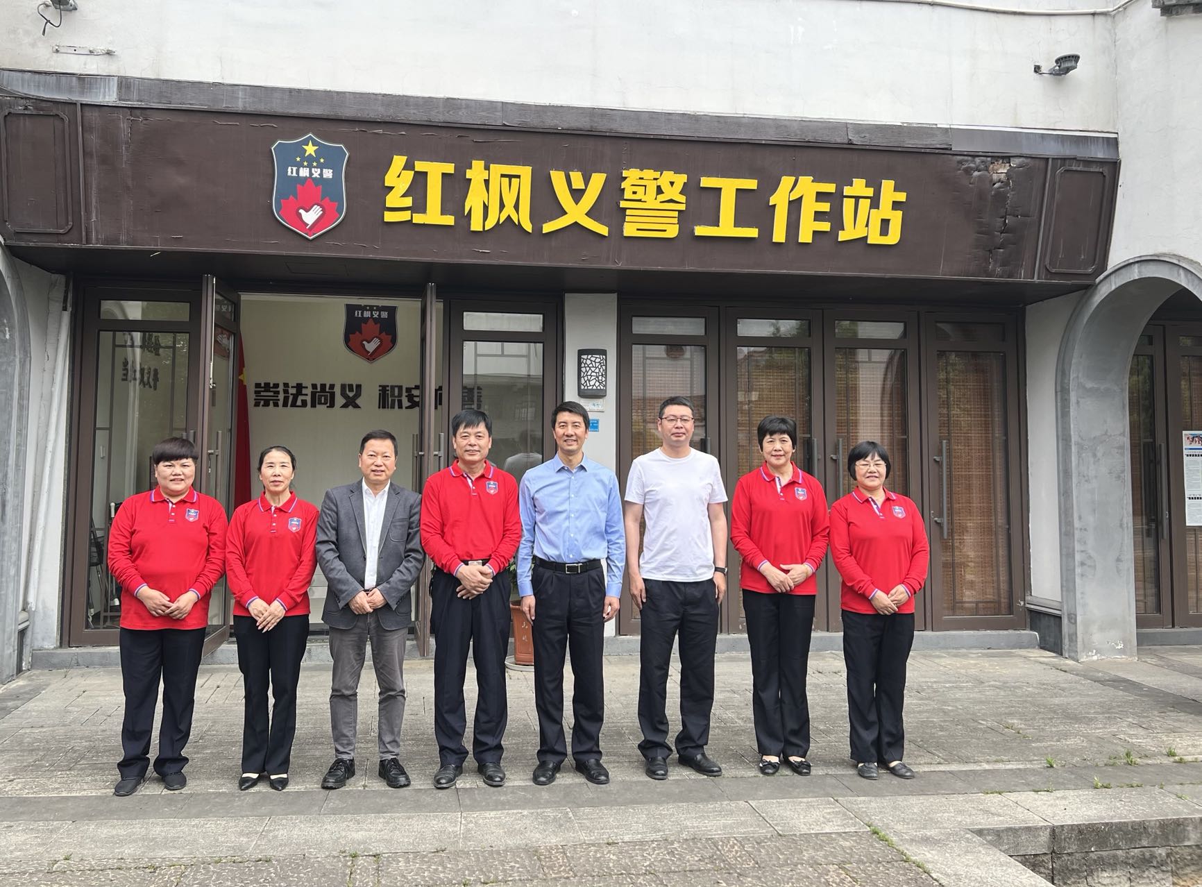 随后,调研团来到红枫义警工作站了解枫桥基层平安建设工作。通过“红枫义警”协会陈荣周会长的介绍,调研团了解到该协会是一支由枫桥派出所引导、群众自发组织参与社会治理的群防群治队伍,协会成员全部是枫桥镇热心平安创建、热爱社会公益且具备一定群众工作经验和社会威望的普通群众,他们各施所长,有效推动形成了决策共谋、平安共管、效果共评、成果共享的共建共治格局。