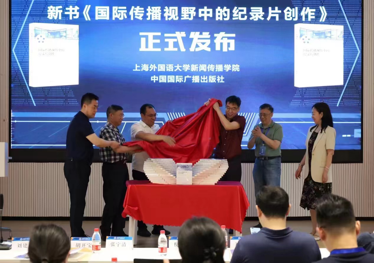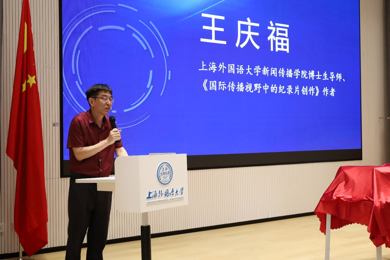 新书发布环节,中国国际广播出版社传媒出版合作部主任祝晔和上海外国语大学博士生导师、新书作者王庆福依次发言,并同与会嘉宾一起为新书《国际传播视野中的纪录片创作》揭幕。
