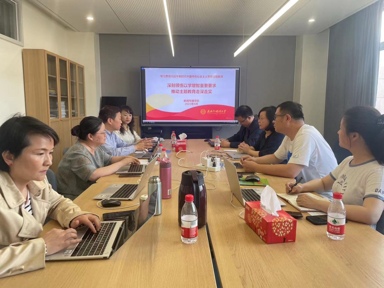 6月2日,新闻传播学院在虹口校区1号楼707会议室召开学习贯彻习近平新时代中国特色社会主义思想主题教育专题研讨会,集体学习习近平总书记在听取陕西省委和省政府工作汇报时发表的“深刻领悟以学增智重要要求 推动主题教育走深走实”重要讲话,学院党政班子成员、行政工作人员代表等出席会议。