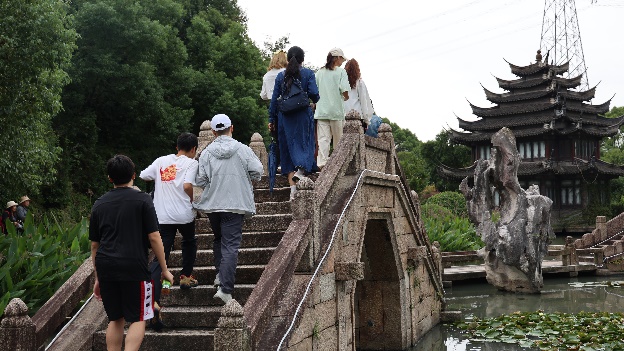 水博园有着深厚的历史底蕴,是当地居民为保护上海饮用取水口安全,自发建成的水生态园。这里有近50座古桥,有千年古树,也有现代皮划艇,一切都在绵绵细雨中更显韵味。同学们一边欣赏风景,一边感受马桥文化,在正式开始报道前细细体会。