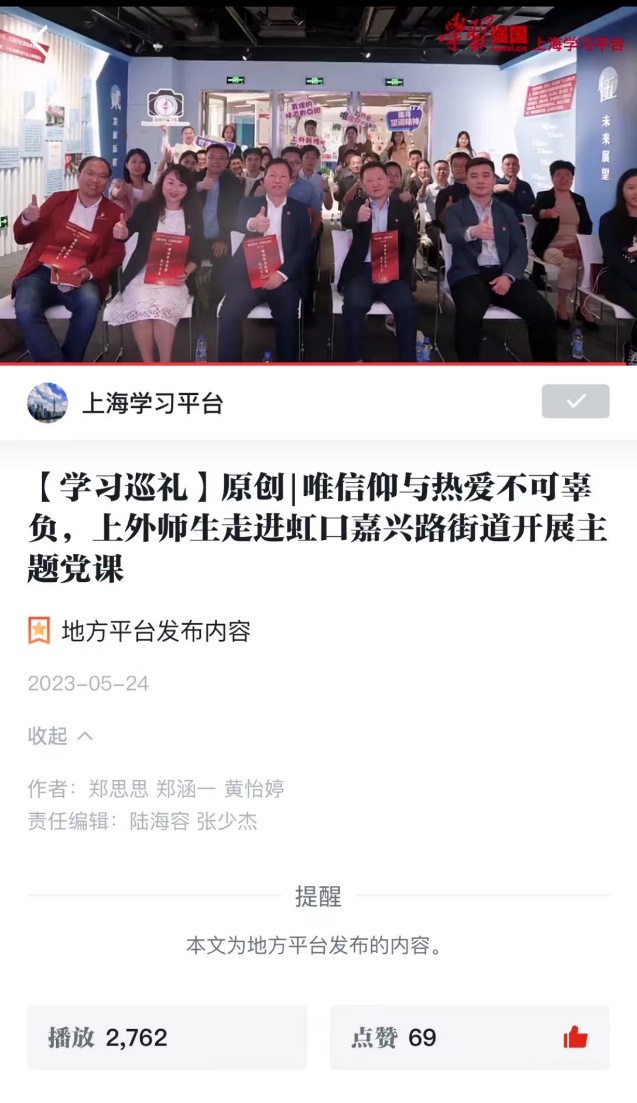 2023年5月23日,支部联合教工党支部与虹口区嘉兴路街道开展主题教育学习,举办“西索新语·党建直播间”第13期——唯信仰与热爱不可辜负,认真学习习近平总书记的两封重要回信精神。本次活动受到了媒体的广泛关注,“学习强国”对活动进行了报道,同时该活动荣获校“优秀组织生活案例”。
