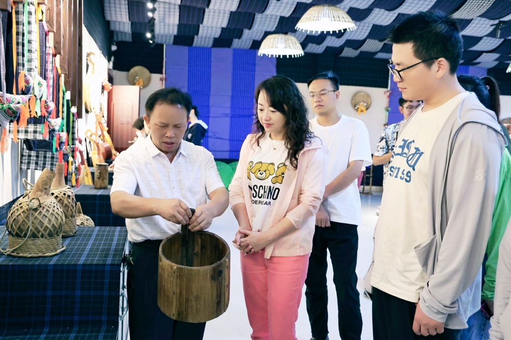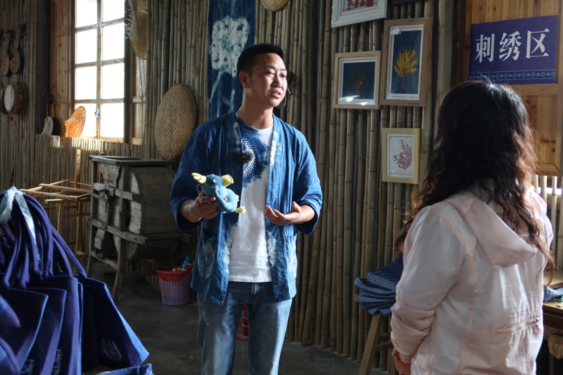 在安龙县古色古香的街道旁,一间名叫“蓝布谣”的非遗工作室吸引了考察团队的目光。工作室内陈设有各色的蜡染、扎染服饰与形式多样的特色文创产品。据工作室负责人介绍,近期,该公司不断外出考察,在原有产品的基础上大胆创新,以民间传统编织的布料为原材料,运用蜡染、刺绣等民族传统手工技艺,将布依族的特色元素与安龙历史人文景观有机融合,积极开发创作文化创意产品,展现地域特色与文化魅力。