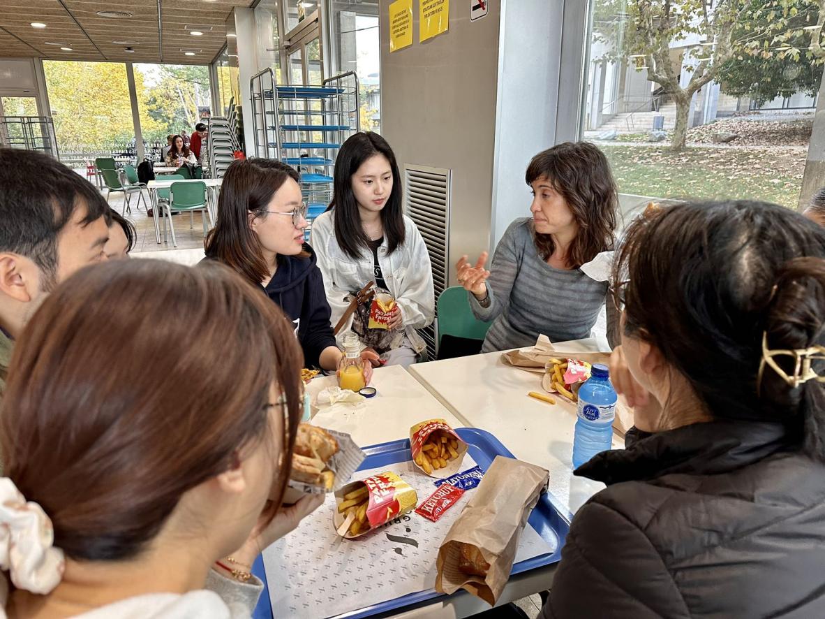 下午15点左右,达芙妮教授邀请上外报道团在巴自治食堂共进午餐。期间,报道团成员与她深入探讨了情感对于体育运动的作用。她认为,体育作为一种“动作”、“行动”,与情感相互影响、相辅相成;巴塞罗那市民的热烈的文化情感在一定程度上激励了该城市足球运动的繁荣。