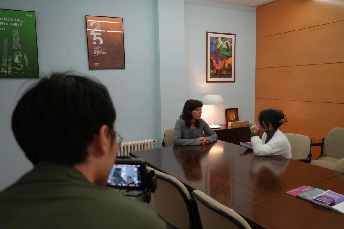 随后,报道团在巴塞罗那自治大学的会议室内对达芙妮教授进行正式采访。顺着报道团的研究主线,达芙妮教授谈及体育精神与城市文化的关系。她认为,一座城市的历史文化内涵在多方面促进了该城市体育项目和精神的发展:比如巴塞罗那的足球教育,就是从巴塞罗那的孩童及青年抓起抓起,这种培训机制培养了队员之间的普遍信任,也促使足球成为巴塞罗那的全民运动;另一方面,巴塞罗那丰富的历史文化内涵,也为球星养成了独特的个人风采。
