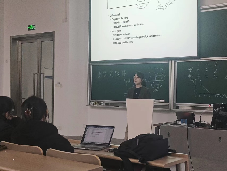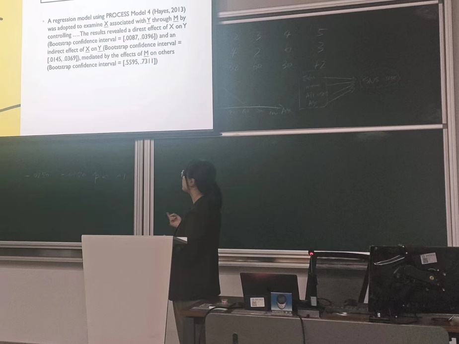 12月12日下午,美国内布拉斯加大学奥马哈分校传播学院助理教授比畅以“调节中介效应:Hayes Process建模法”为主题,为新闻传播学院博士生带来一场精彩的讲座,详细介绍了如何利用Process的模型进行中介和调节效应分析。比畅老师主要研究方向为亲社会战略传播、品牌活动、健康传播以及人工智能的应用。