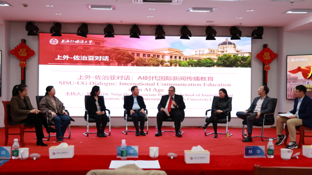 在启动仪式的第二部分,上外新闻传播学院的四位教师代表与来自美国佐治亚大学的三位教师代表开展了以“AI时代国际新闻传播教育”为主题的上外-佐治亚对话,对话由上外新闻传播学院副教授展宁主持。佐治亚大学格雷迪新闻与大众传播学院院长Charles N. Davis首先作了题为“塑造高等教育的力量:新闻与大众传播教育的现状和新兴趋势”的主旨演讲。他强调,AI技术发展日新月异,应重点培养学生的核心技能和新闻原则,以适应不断变化的行业需求,而不是过分依赖特定的技术平台。郭可院长随后作了题为“人工智能技术对新闻与传播教育的影响:课程与模式”的主旨演讲。他表示,新闻传播教育面临AI技术带来的挑战,需要调整教学模式,结合媒介技术发展前沿迭代课程体系,以适应时代变革。圆桌讨论阶段,佐治亚大学格雷迪新闻与大众传播学院广告与公共关系系主任Juan Meng和副教授Itai Himelboim,以及上外新闻传播学院三位副院长陈沛芹、严怡宁、诸廉分别分享了自己对于AI时代国际新闻传播教育的见解,也探讨了未来两个学院进一步开展教学科研合作的可能性。