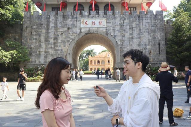 国新班的同学们同时也在友谊关景区随机采访了几位从友谊关口岸入境的越南游客,游客们表达了对之后在中国旅游的期待。其中一位游客说道:“感觉中国很大很漂亮。”