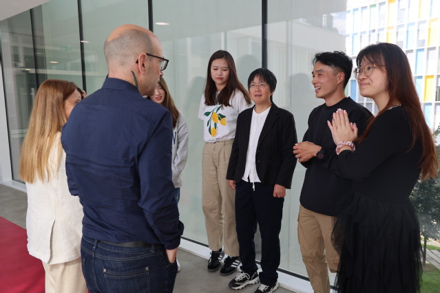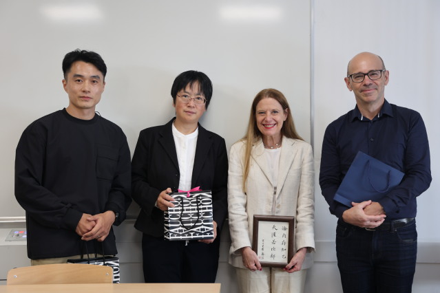 午后,团队成员们来到了本次调研行程中非常期待的环节——访问法国巴黎第三大学(Sorbonne Nouvelle),副校长 Françoise Lavocat女士和巴黎三大国际合作亚洲区主任、艺术与文化地缘政治研究生院院长Laurent Martin教授热情接待。见面伊始,双方的老师们以最诚挚的礼节相互致敬,并交换了富有深意的礼物。林岩老师和曹帅老师将精美的书法作品赠予了法国的同仁们,“海内存知己,天涯若比邻”诗句承载着上外对情谊的珍视,象征着两校之间跨越山海的深厚友谊。