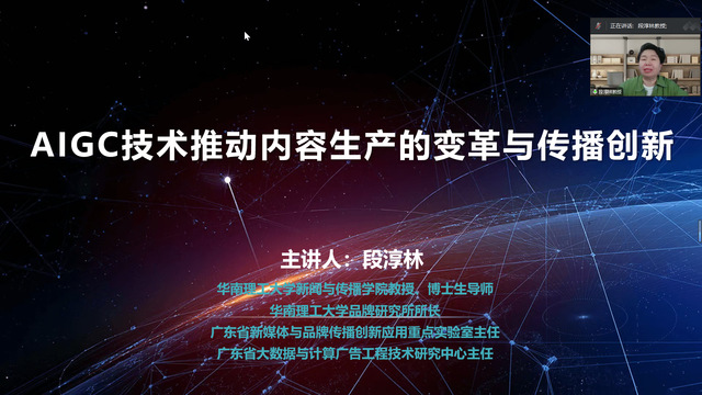 10月29日上午,学院邀请了华南理工大学新闻与传播学院的段淳林教授在线上为我院研究生带来题为《AIGC技术推动内容生产的变革与传播创新》的学术讲座。本次讲座由崔莉萍教授主持。