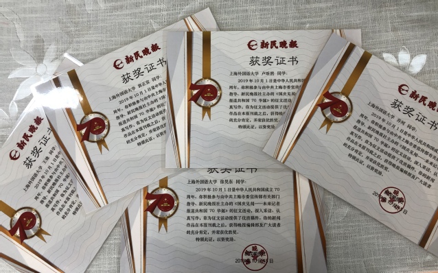近日,在市委宣传部部校共建新闻学院领导小组办公室的协调下,新民晚报社举办了《国庆一日 —— 未来记者报道共和国70华诞》征文活动,组织未来记者们紧扣“礼赞新中国, 奋进时代”主题,运用手中彩笔、 相机镜头, 采用消息、 特写消息、 特写侧记、 新闻图片等形式, 报道浦江两岸喜庆新中国 70 华诞的欢乐之景,反映城乡居民欢度国庆的喜悦心情。上外新闻传播学院学生积极参与这一征文活动,卢昕然、郭正宜、王姝、徐昊东、乔珂等同学获得优胜奖。